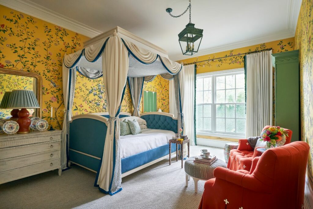 A timeless blue and white canopy bed is turned sideways in the room to feel more like a daybed and to allow ample space for a seating area that invites guests to relax and unwind from the day.